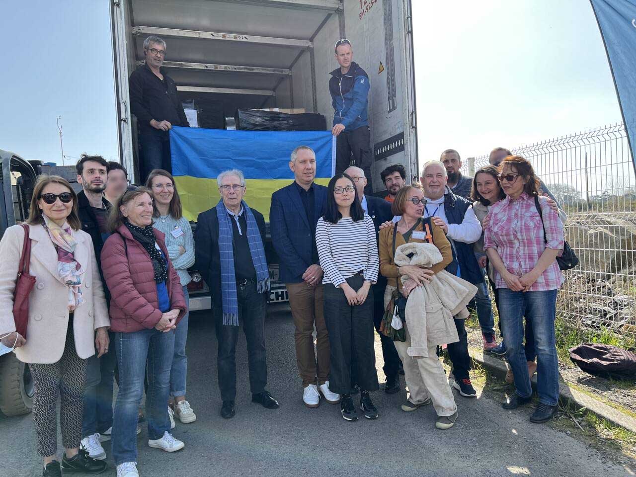 Bénévoles de l’association franco-ukrainienne Tryzub, membres de la Maisonde l’Europe, représentants de Nantes métropole, chauffeur et organisateurs du convoi, à quelques minutes du départ.