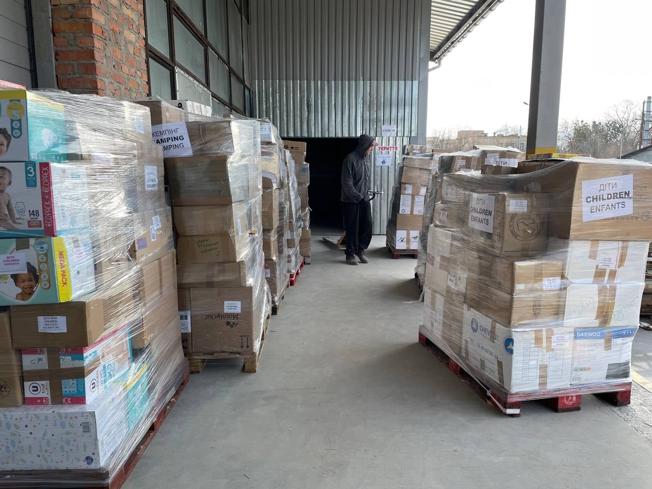 Набір із 31 завантаженої палети містить ліки, туристичне спорядження, продукти харчування та засоби гігієни.