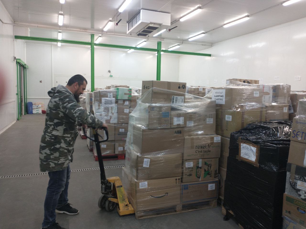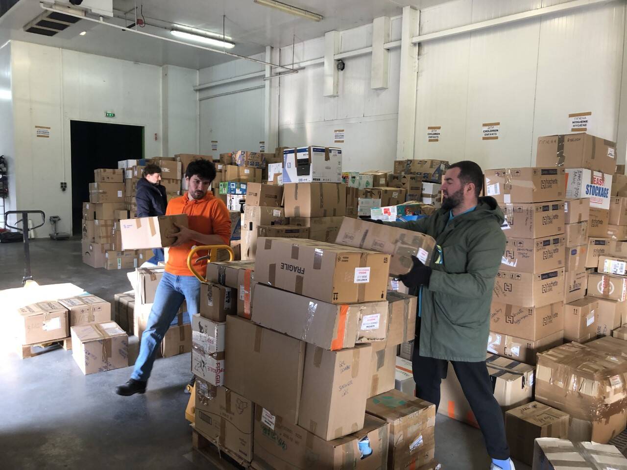 Mise en palette des premiers dons destinés à l’Ukraine. À gauche, Guillaume, en charge de la logistique. À droite, Igor.