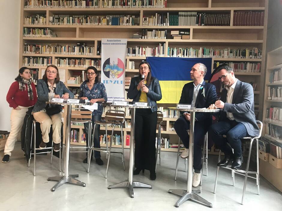 Les responsables de l’association Tryzub, avec Karine Daniel, présidente de la maison de l’Europe, André Sobczak et Yves Pascouau.