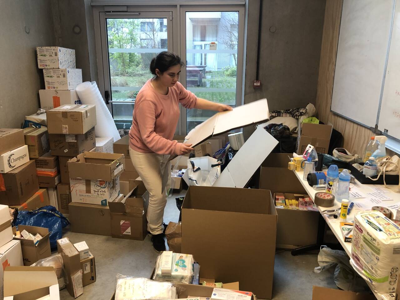 Une des bénévoles de l’association Tryzub prépare les colis humanitaires à destination de l’Ukraine, au sein de la maison de l’Europe.
