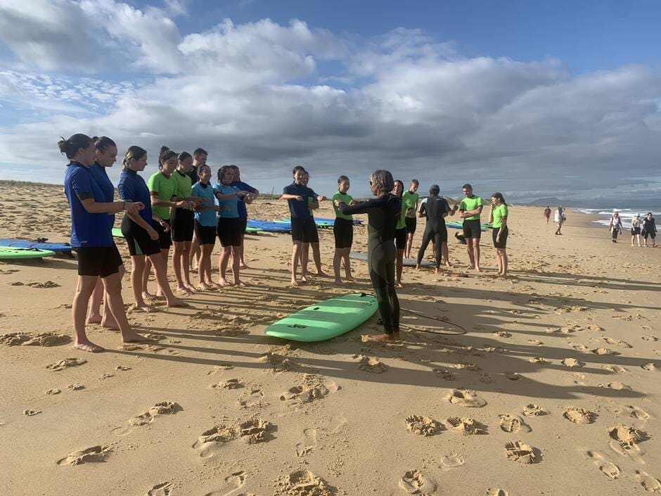 Initiation au surf pour des jeunes Ukrainiens et Français lors d’un séjour commun à Biarritz, organisé par Animaje, cet été. [ photo : Ouest France ]