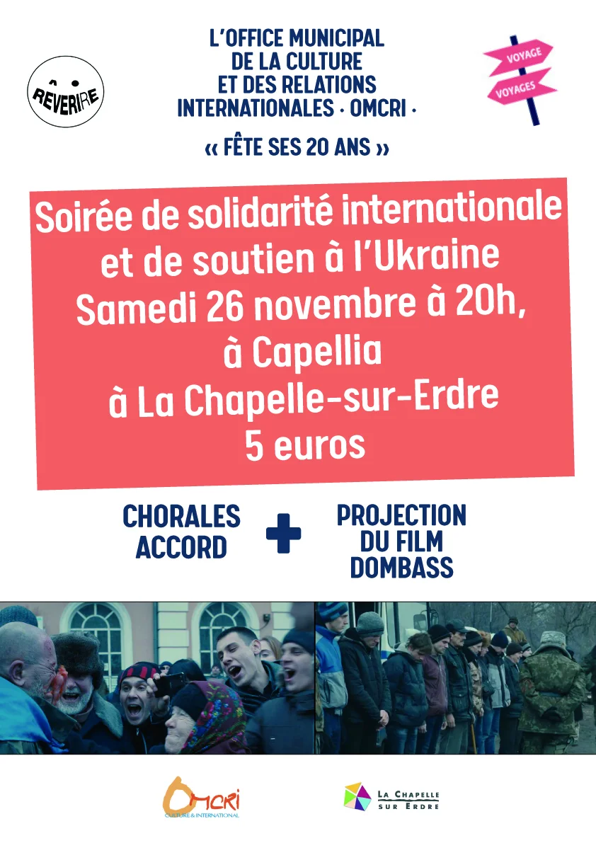nous organisons une soirée en soutien à l’Ukraine avec chants et film, le samedi 26 Novembre à 20h, salle Capellia à la Chapelle-sur-Erdre.