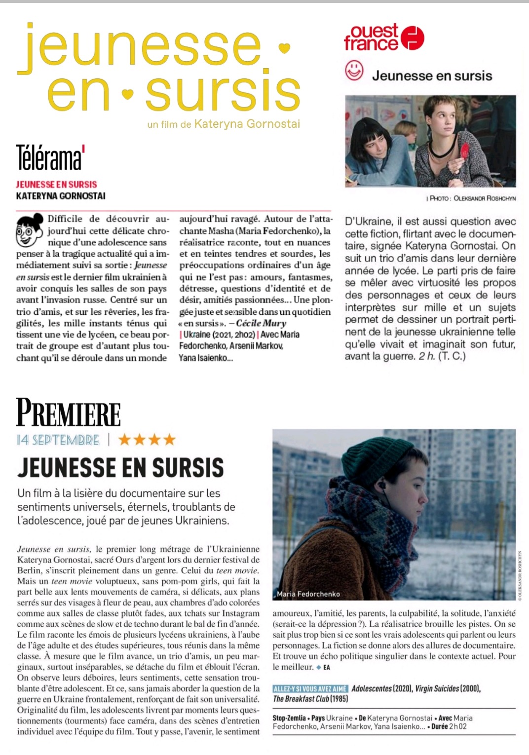 Le film ukrainien "Jeunesse en sursis" de Kateryna Gornostai est sorti à Nantes au cinéma Concorde le 14 septembre 2022. Ouest France a publié un article sur le film, grâce auquel vous pourrez faire connaissance avec le sujet, les créateurs et acteurs du film.