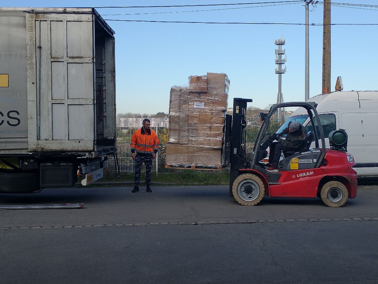 Aujourd'hui, vos dons organisés en dix-huit palettes sont partis de Nantes en Pologne avec les chauffeurs de la Protection Civile.