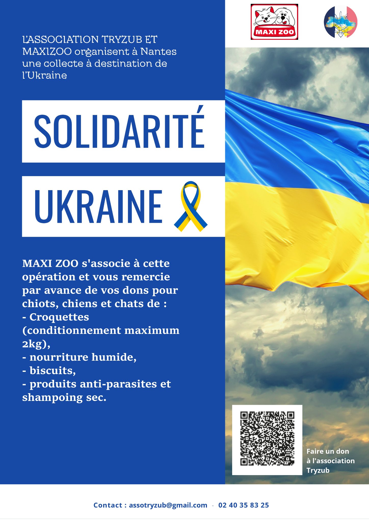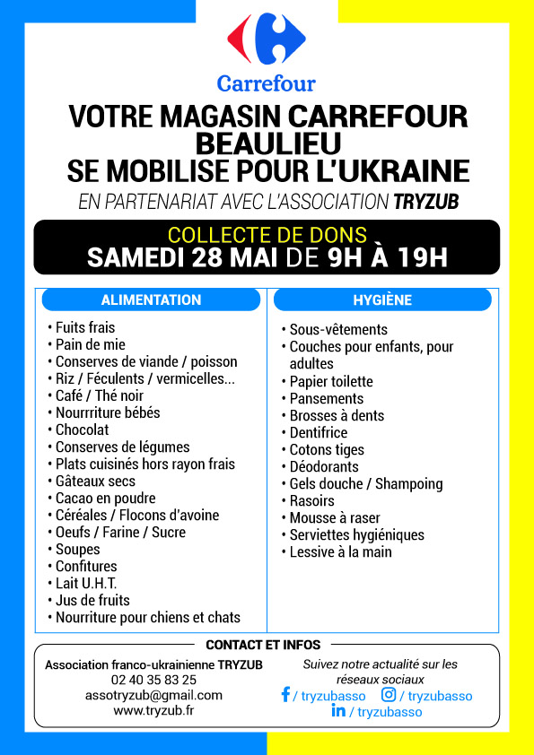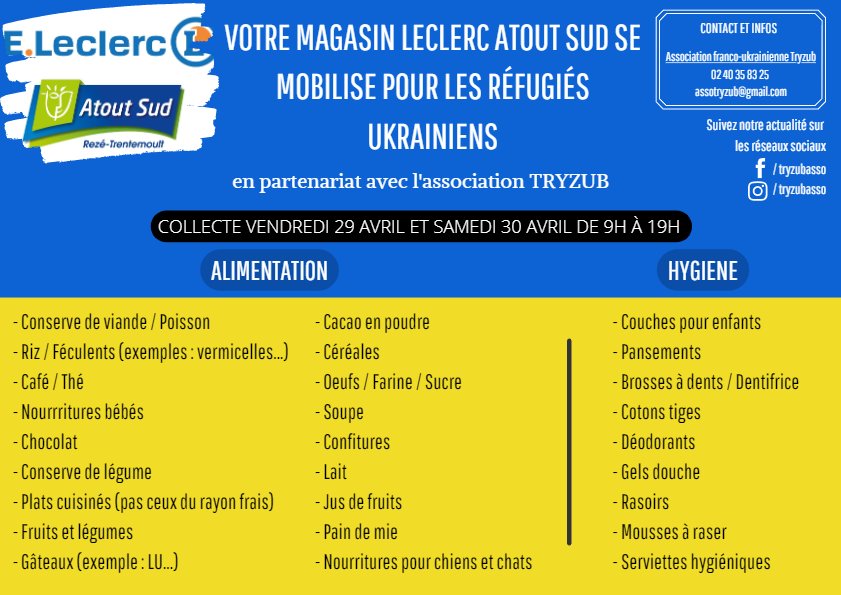Rendez vous le vendredi 29 avril et le samedi 30 avril au Leclerc Atout Sud de Rezé qui se mobilise pour l'Ukraine et les réfugiés arrivés à Nantes.