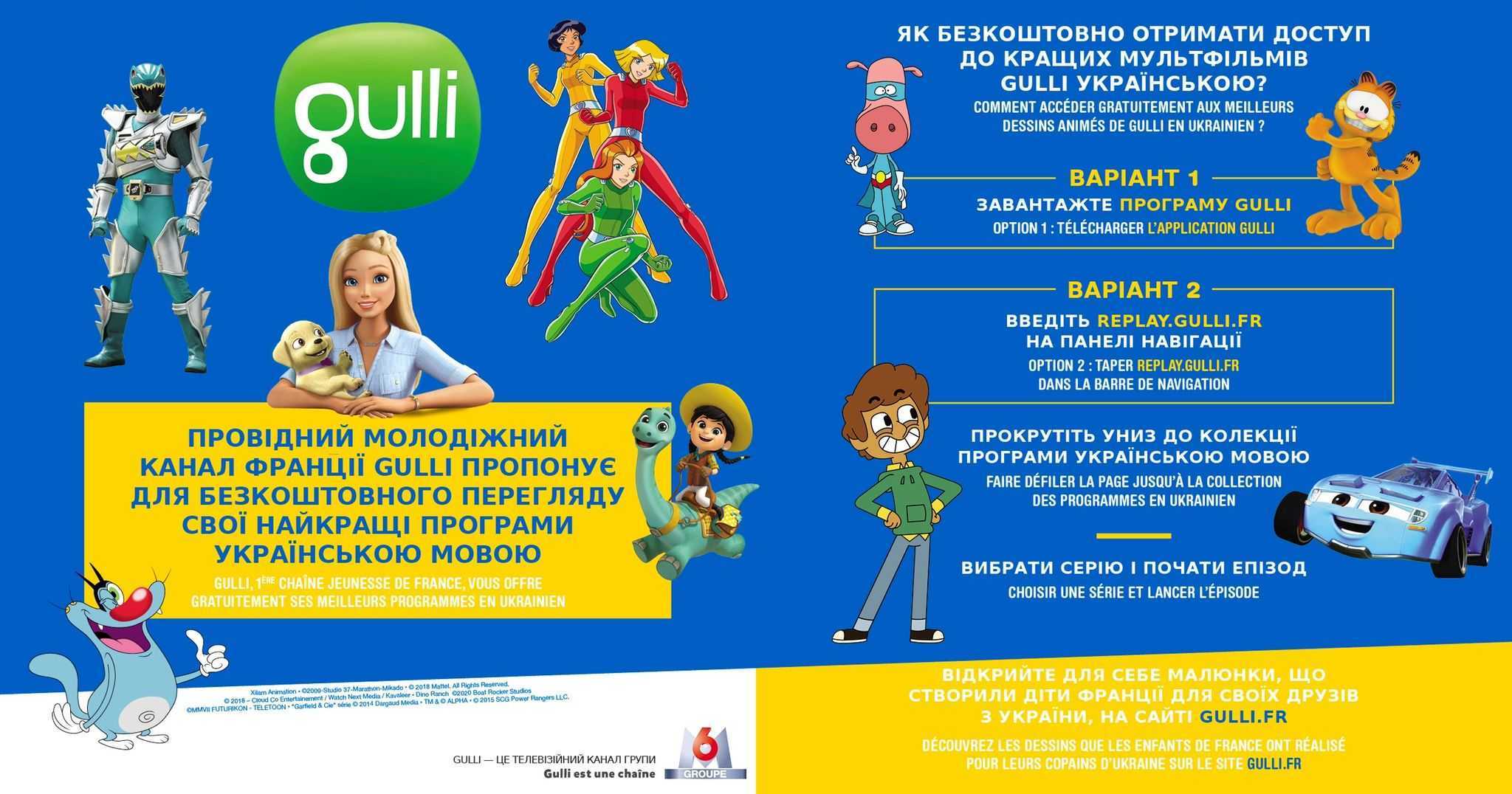 La Chaîne TV Jeunesse GULLI propose ses « meilleurs programmes » gratuitement en langue ukrainienne. Rendez-vous sur le REPLAY de la chaîne ou télécharger l’application.