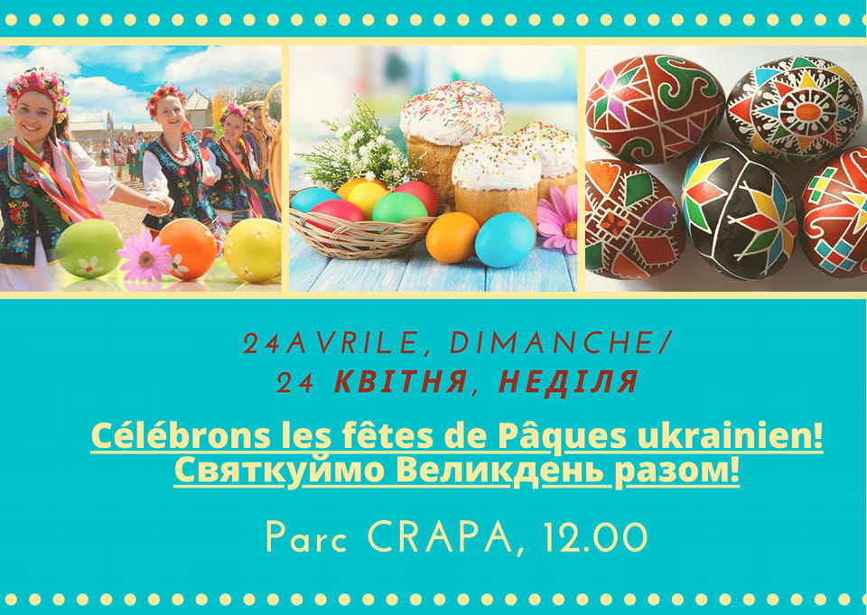 La Pâques ukrainienne approche et nous voulons la célébrer avec nos amis, nos chers bénévoles qui travaillent si dur pour aider l'Ukraine. Nous voulons également partager cette fête avec les Ukrainiens, les nouveaux arrivants et ceux qui vivent ici depuis longtemps. Nous vous invitons tous à venir au parc Crapa à 12h le dimanche 24 avril. Chacun peut apporter selon ses possibilités quelque chose à partager avec les autres. Nous fournirons des boissons, des brioches traditionnelles de Pâques (Paska), des œufs de Pâques colorés et quelques plats traditionnels. Aussi nous vous inviterons à participer à nos ateliers de décoration des oeufs de Pâques pendant le pique-nique.